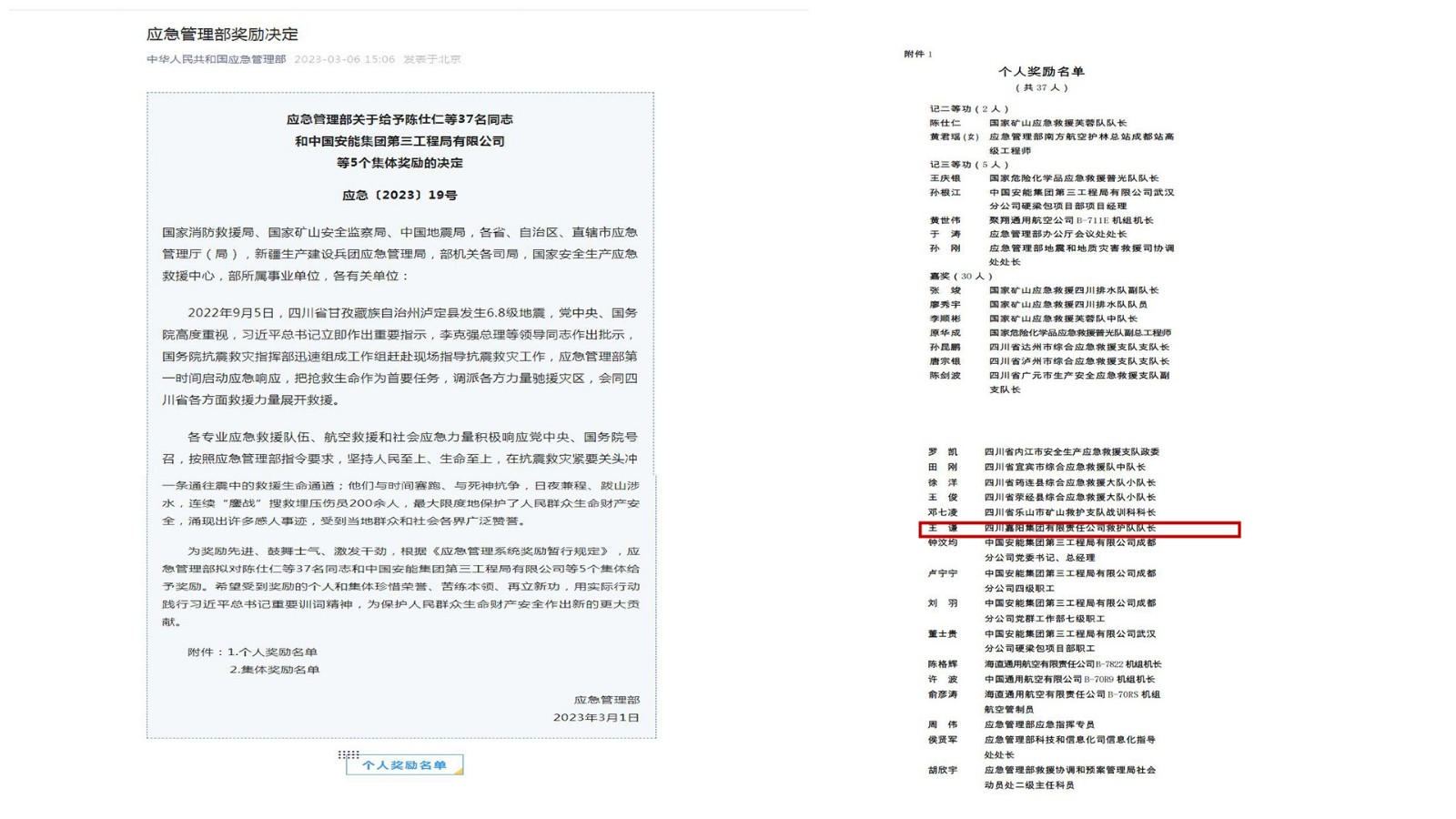 近日,應(yīng)急管理部[2023]19號(hào)文件下發(fā),對(duì)瀘定抗震救災(zāi)表現(xiàn)突出的個(gè)人和集體進(jìn)行獎(jiǎng)勵(lì),嘉陽集團(tuán)礦山救護(hù)隊(duì)隊(duì)長王謙榜上有名。