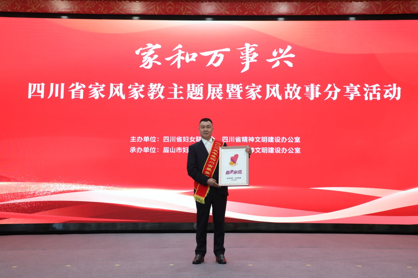 活動現(xiàn)場,省文明辦副主任胡偉、眉山市人大常委會副主任王澤文為最美家庭代表頒獎?;顒舆€開展了家風(fēng)故事分享、“四川省家和萬事興——家風(fēng)家教主題展”啟動儀式等。
