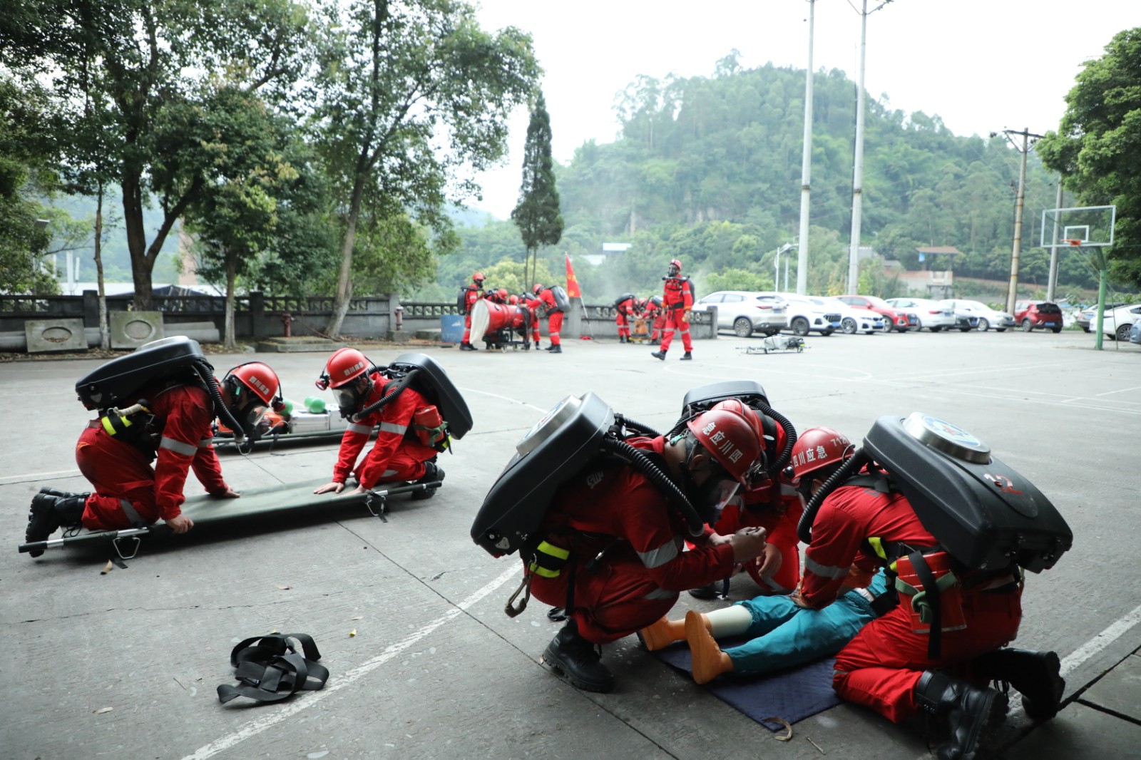 此次演練以復(fù)雜條件下的救援演練為主,全程佩帶重達(dá)13公斤的氧氣呼吸器,著重在于培養(yǎng)救援隊(duì)員的耐氧度和高濕條件下的佩機(jī)忍耐力。戰(zhàn)前分工、受領(lǐng)任務(wù)、集合隊(duì)伍、整裝待發(fā),上午9點(diǎn)30分,萬米戴機(jī)行走在指揮員響亮的口令中拉開了演練的序幕,佩帶齊全裝備的隊(duì)員們向著目的地一路進(jìn)發(fā),一身國旗紅在礦區(qū)、在山間路上格外引人注目?;Q氧氣瓶、傷員急救包扎轉(zhuǎn)運(yùn)模擬、安設(shè)高泡滅火機(jī)滅火、高溫濃煙,各小隊(duì)按照任務(wù)分工迅速到達(dá)指定地點(diǎn)有序展開工作。在兩個(gè)多小時(shí)的訓(xùn)練中,隊(duì)員們團(tuán)結(jié)協(xié)作、密切配合,圓滿完成了指定任務(wù)。通過聯(lián)合演練,檢驗(yàn)了隊(duì)員們的身體素質(zhì)、技戰(zhàn)術(shù)水平、應(yīng)急反應(yīng)能力和團(tuán)結(jié)協(xié)作能力,確保隊(duì)伍戰(zhàn)時(shí)拉得出、沖得上、打得贏。