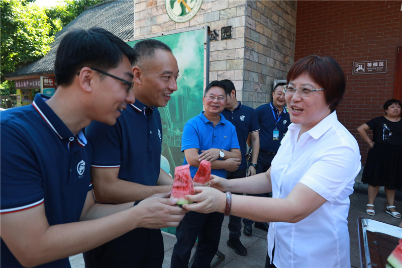 劉曉揚主席一行人不顧長途行車的勞頓,下車直奔驕陽下的嘉陽煤礦井口工業(yè)廣場,下車間、走作業(yè)現(xiàn)場,劉曉揚主席一邊招呼大家停下手中的工作休息,一邊將西瓜、冰粉、礦泉水等解暑飲品送到職工手中,并關(guān)切地詢問職工生產(chǎn)、生活等情況,囑咐大家在高溫作業(yè)時,要注意防暑降溫,增強自身安全防范意識,合理安排作業(yè)內(nèi)容,確保自身身體健康和企業(yè)安全生產(chǎn)。