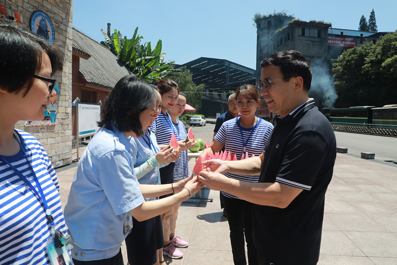 盛夏炎炎,驕陽似火。懷林副總又頂著烈日奔赴川投峨旅和嘉陽煤礦生產一線,看望慰問堅守在高溫崗位上的職工同志們,為火車司機、講解員和煤礦一線職工送上甘甜的西瓜和清涼的礦泉水。所到之處,懷林副總為職工們送上西瓜,并親切叮囑他們“天氣炎熱工作時更要注意自身安全!”他要求嘉陽和峨旅要切實將防暑降溫工作落到實處,全方位保障高溫崗位職工的身體健康和安全。