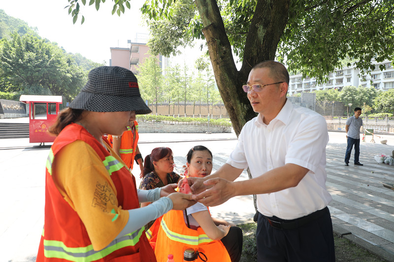 “師傅們,歇一歇吃塊西瓜涼快、涼快!”在主碑廣場,范總經(jīng)理親切地招呼正在這里修剪樹枝的作業(yè)人員、環(huán)衛(wèi)工人們,并將清涼的西瓜和礦泉水遞到他們手中。在預(yù)制廠改造工地,范總詢問了解工程情況,叮囑作業(yè)人員:“天氣炎熱一定要做好防暑降溫措施,注意自身健康?!贝蠹议_心地發(fā)出爽朗的笑聲,對公司領(lǐng)導(dǎo)、黨員同志們頂著烈日來看望我們、給我們送來清涼表示非常感謝,大家的關(guān)心與鼓勵給了我們戰(zhàn)高溫、斗酷暑的勇氣和力量,我們必將不畏高溫、堅守崗位,保質(zhì)保量地完成生產(chǎn)任務(wù)。