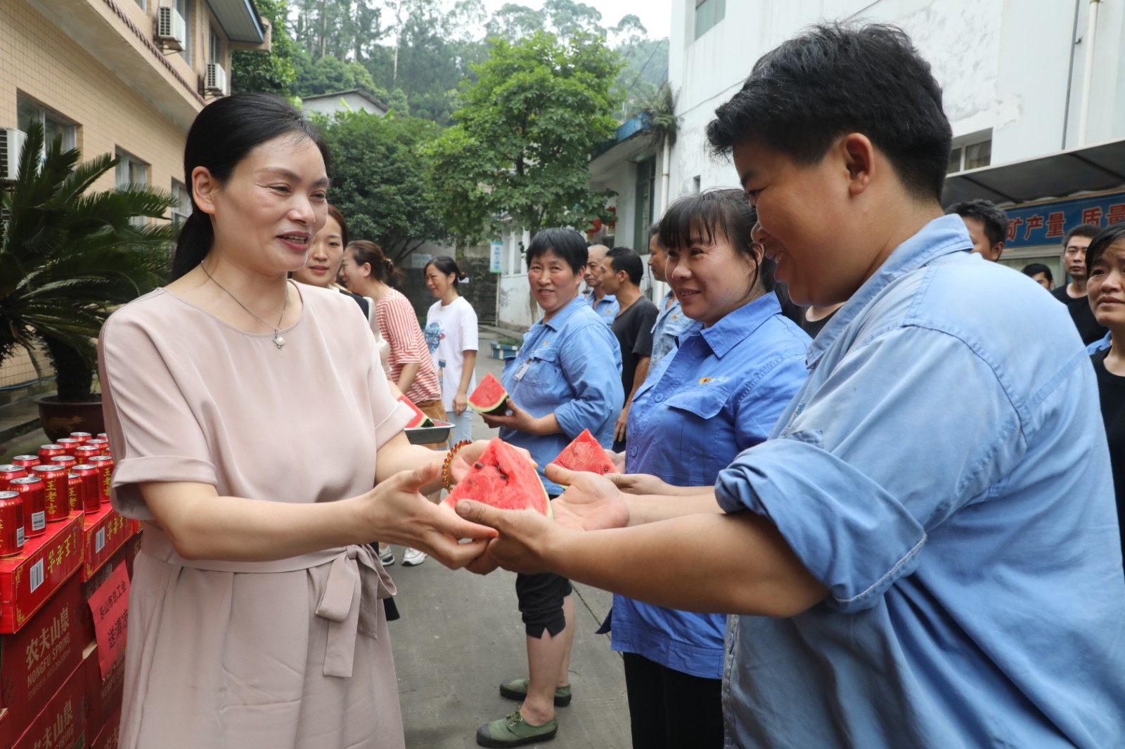 炎炎夏季,驕陽(yáng)似火,酷熱難耐,嘉陽(yáng)煤礦職工依然堅(jiān)守崗位,用他們的汗水為企業(yè)發(fā)展、社會(huì)需求貢獻(xiàn)著自己的力量。“大兄弟,來(lái),吃一塊西瓜涼快涼快”,在嘉陽(yáng)煤礦井口,樂(lè)山市總工會(huì)黨組成員、機(jī)關(guān)黨委書(shū)記張慧一邊招呼著礦工兄弟,一邊把一塊塊切好的西瓜送到礦工們的手中;市總工會(huì)組宣部部長(zhǎng)鮑學(xué)智,主任科員張海濱也忙著將一瓶瓶消暑飲料遞到職工們的手上,叮囑大家在確保安全生產(chǎn)的同時(shí)不忘防暑降溫,絲絲關(guān)愛(ài)源源流進(jìn)職工們的心田。