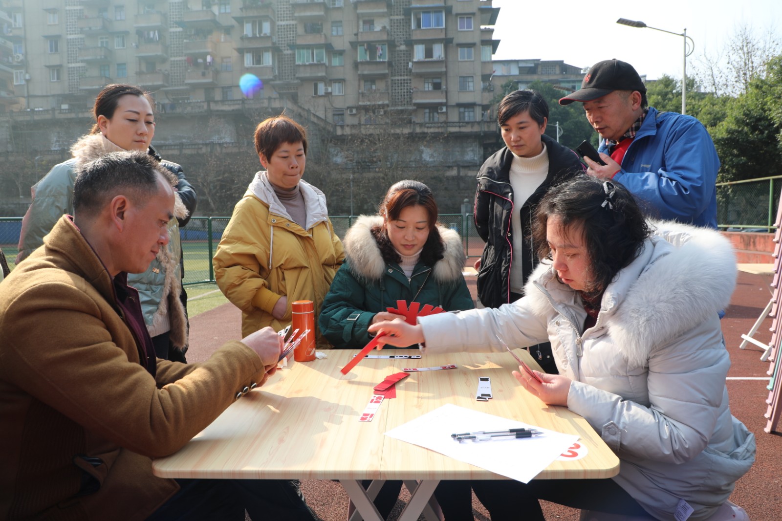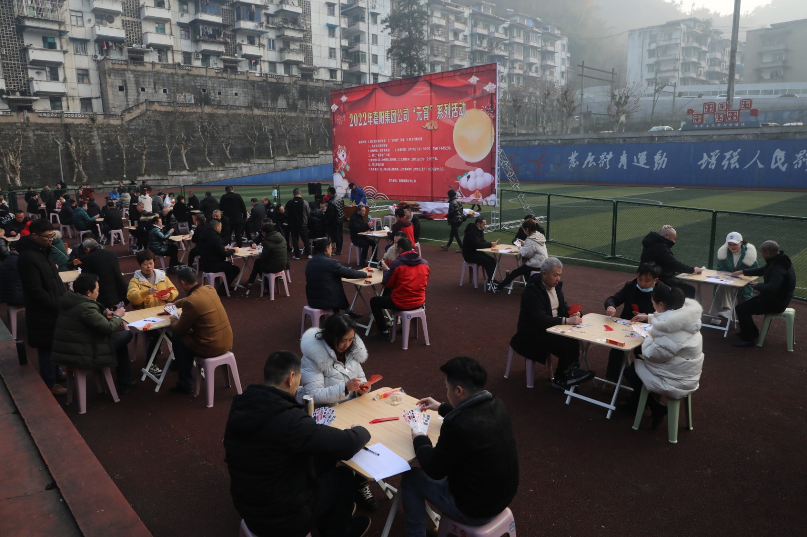 “貳柒拾”是職工們喜愛的娛樂形式。九點整,比賽在礦區(qū)官斗山足球場開始。比賽以淘汰制方式進行,81名選手分成27桌,比賽座位按抽簽定桌,每桌決出第一名進入到下一輪,每輪比賽40分鐘。扯牌、進張、聽牌、和牌,場上千變萬化,拼手氣、比技術、賽心態(tài),趣味無窮、歡樂多多,上一盤“抬了炮”沒關系,下一盤爭取和個“圈坤大”……選手一邊“扯著”手中的牌,一邊嘻嘻哈哈,氣氛融洽。經(jīng)過四輪比賽,最終來自綜司的陳朝才、何羽分獲一、二名,嘉陽煤礦的徐艷英獲得第三名。
