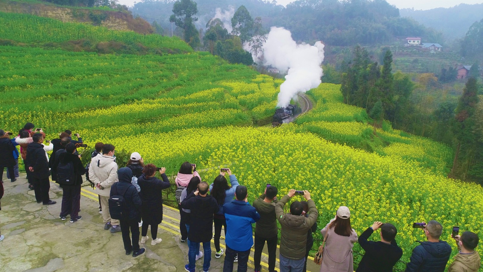 媒體團(tuán)采風(fēng)的第一站是嘉陽小火車躍進(jìn)站,從這里搭乘歷史悠久的窄軌蒸汽小火車,沿著蜿蜒旖旎的芭石鐵路前行,一路欣賞與記錄青山綠水與農(nóng)業(yè)生態(tài)新面貌。在這春意盎然的絕美旅途中,媒體團(tuán)先后在段家灣及亮水沱駐足停留,欣賞小火車穿越油菜花海與“鐵龍飛虹”的靚麗畫卷,并為現(xiàn)場的新人伉儷拍攝婚紗照片,共同見證浪漫愛情。