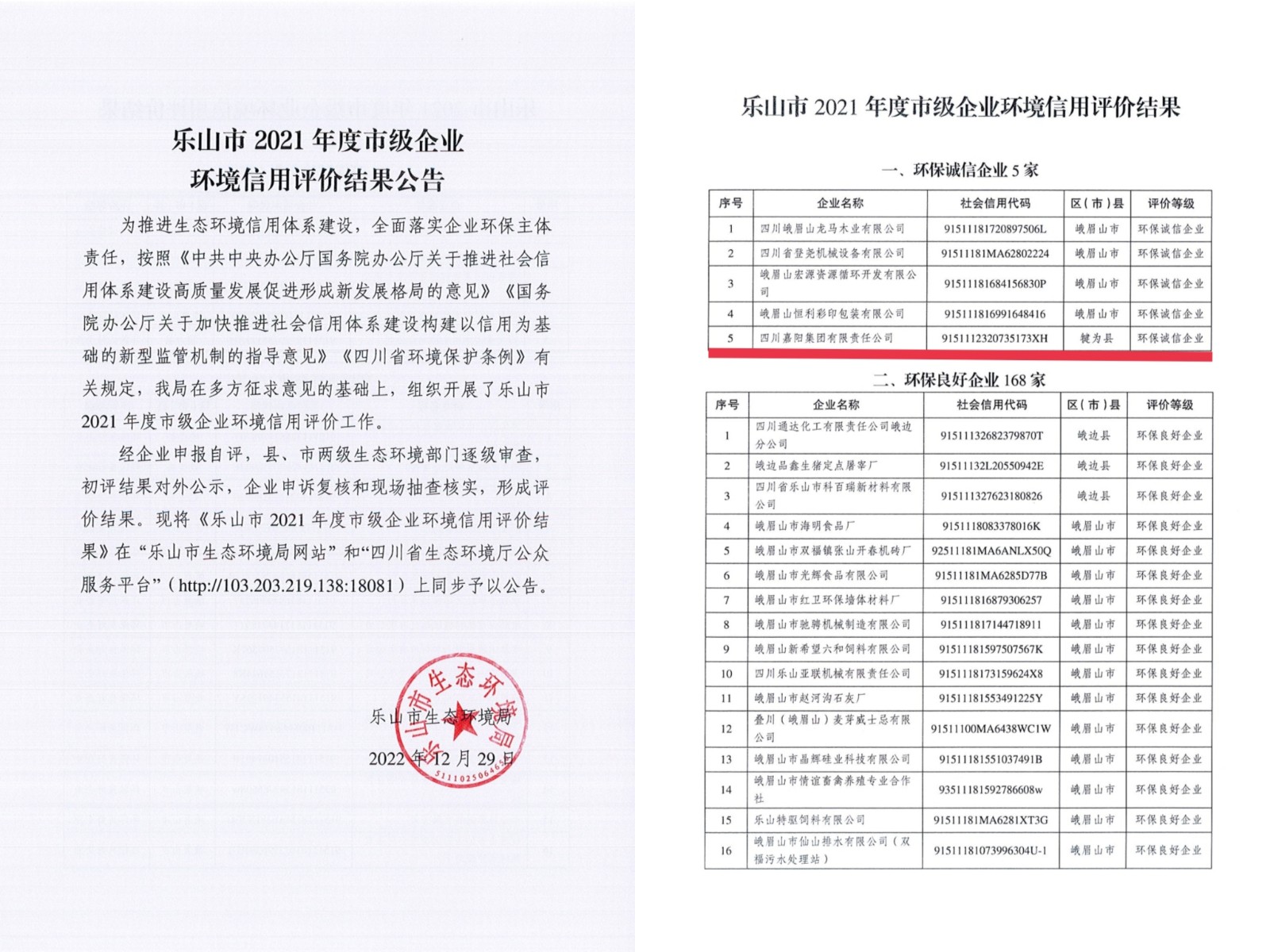 12月29日,樂山市生態(tài)環(huán)境局公布了2021年度市級(jí)企業(yè)環(huán)境信用評(píng)價(jià)結(jié)果公告,嘉陽集團(tuán)榮獲此次環(huán)境信用評(píng)價(jià)中的最高等級(jí)“環(huán)保誠(chéng)信企業(yè)”稱號(hào),這也是嘉陽集團(tuán)連續(xù)四年獲得該項(xiàng)榮譽(yù)。