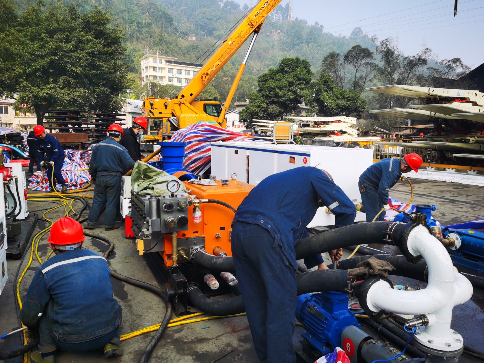 1月6日起,嘉陽煤礦第二條智能化綜采生產(chǎn)線設(shè)備陸續(xù)到礦,將安裝于采煤二隊(duì)31231采面。按照計(jì)劃,生產(chǎn)線設(shè)備入井前將在地面進(jìn)行刮板運(yùn)輸機(jī)、采煤機(jī)、液壓支架三機(jī)聯(lián)合調(diào)試,以確保在井下復(fù)雜環(huán)境中能夠順利投產(chǎn)。地面安裝由廠方技術(shù)人員指導(dǎo),采煤二隊(duì)負(fù)責(zé)液壓支架、采煤機(jī)、刮板運(yùn)輸機(jī)、膠帶運(yùn)輸機(jī)、自動化控制系統(tǒng)、監(jiān)控中心、綜采自動化控制系統(tǒng)、電液控制系統(tǒng)的安裝調(diào)試,機(jī)電隊(duì)負(fù)責(zé)集成供液、供電系統(tǒng)及對應(yīng)管路的安裝調(diào)試,調(diào)度中心負(fù)責(zé)地面聯(lián)調(diào)的視頻系統(tǒng)、工業(yè)視頻系統(tǒng)、網(wǎng)絡(luò)安裝維護(hù)、智能化綜采通訊系統(tǒng)等安裝、調(diào)試及維護(hù),機(jī)電運(yùn)輸科、生產(chǎn)技術(shù)科、安全環(huán)保科、材料組等職能部門負(fù)責(zé)地面聯(lián)調(diào)的技術(shù)支持、安全監(jiān)督及后勤保障。現(xiàn)場,各隊(duì)技術(shù)精英嚴(yán)格按照標(biāo)準(zhǔn)吊裝設(shè)備到指定位置,有序拆除設(shè)備包裝,分工進(jìn)行大量的纜線和管道連接。