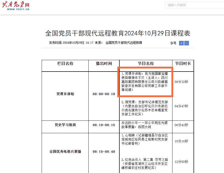 10月29日,由中共中央組織部主管、中央組織部黨員教育中心主辦的共產(chǎn)黨員網(wǎng)公布全國黨員干部現(xiàn)代遠(yuǎn)程教育課程表,集團(tuán)公司微堂課《我為祖國獻(xiàn)寶藏 燃燒精神永不滅》精彩亮相,用6分32秒的時(shí)長為全國的黨員們呈現(xiàn)了難忘的一課。
